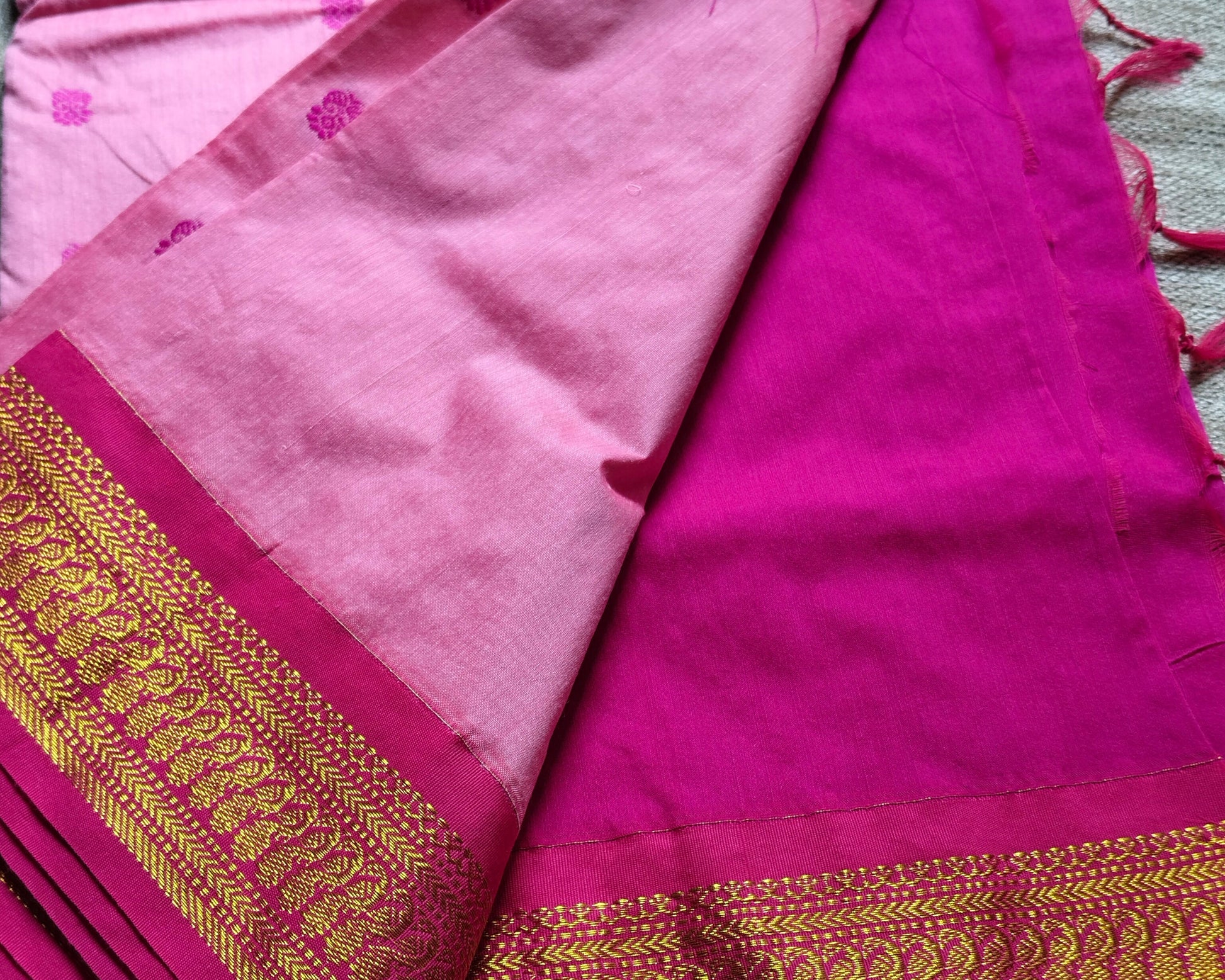 Pink pure cotton saree with magenta blouse. The Saree has motifs all over body with a beautiful magenta zari pallu.
