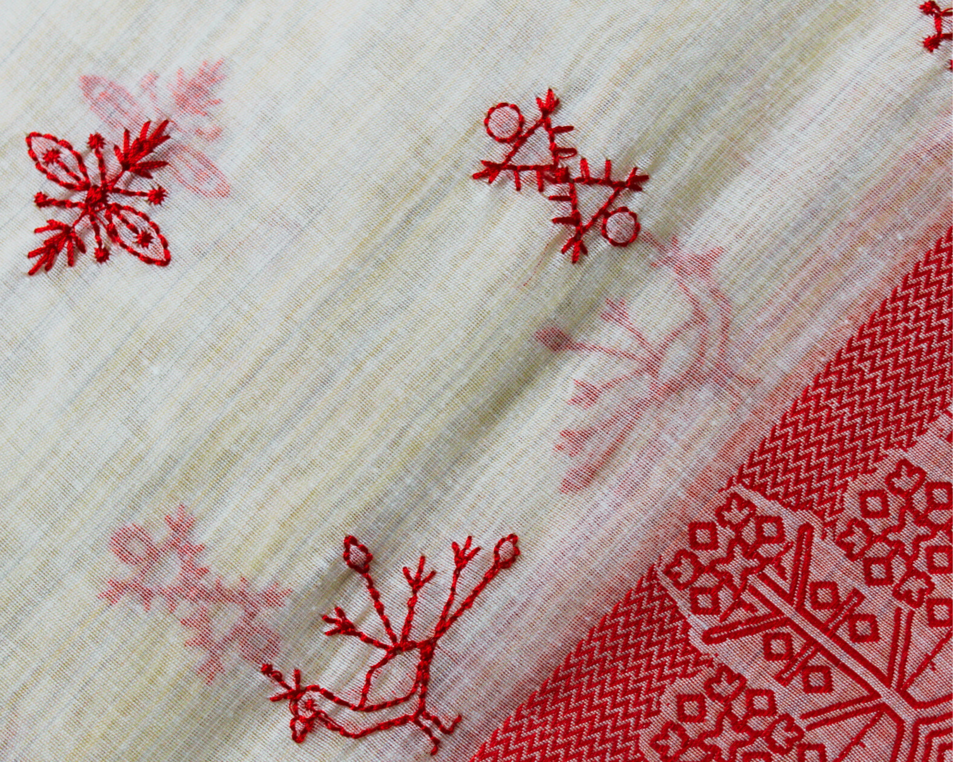 Red and Off White Tussar Cotton Silk saree with all over kantha work with intricate woven border. The saree features exquisite handwoven designs on the border inspired by nature.