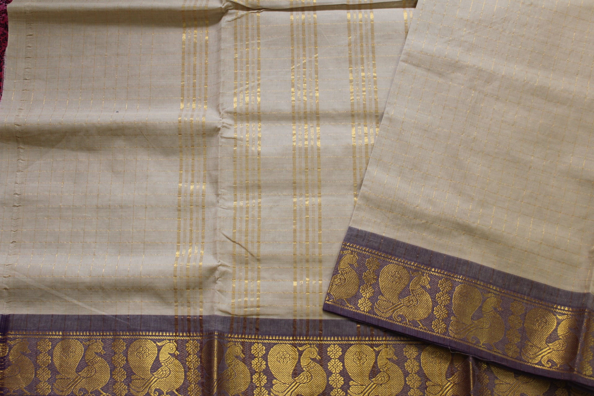 Beige Zari Checks Pure Cotton Saree with zari woven mayuri design brown border, the saree comes without blouse.