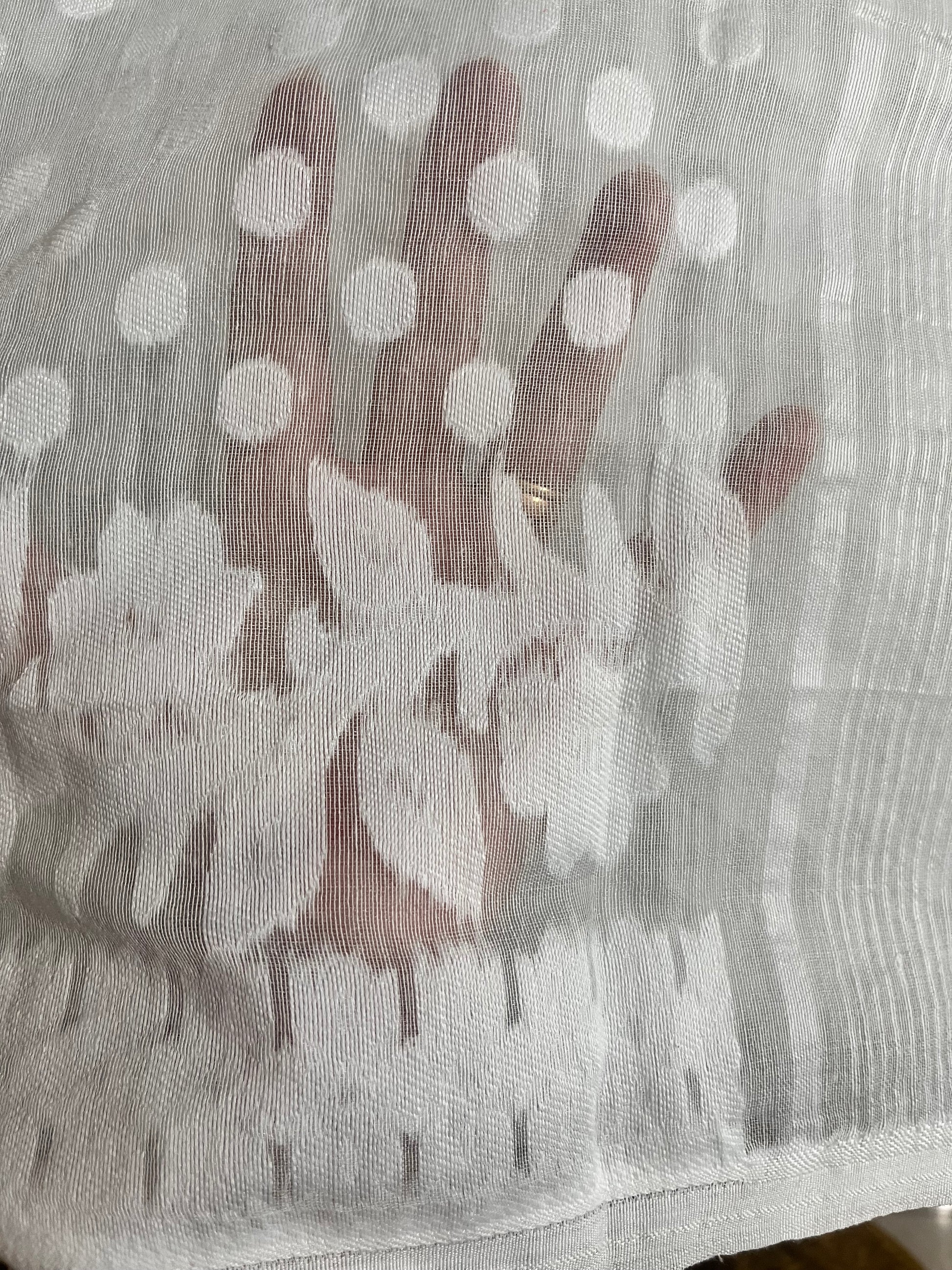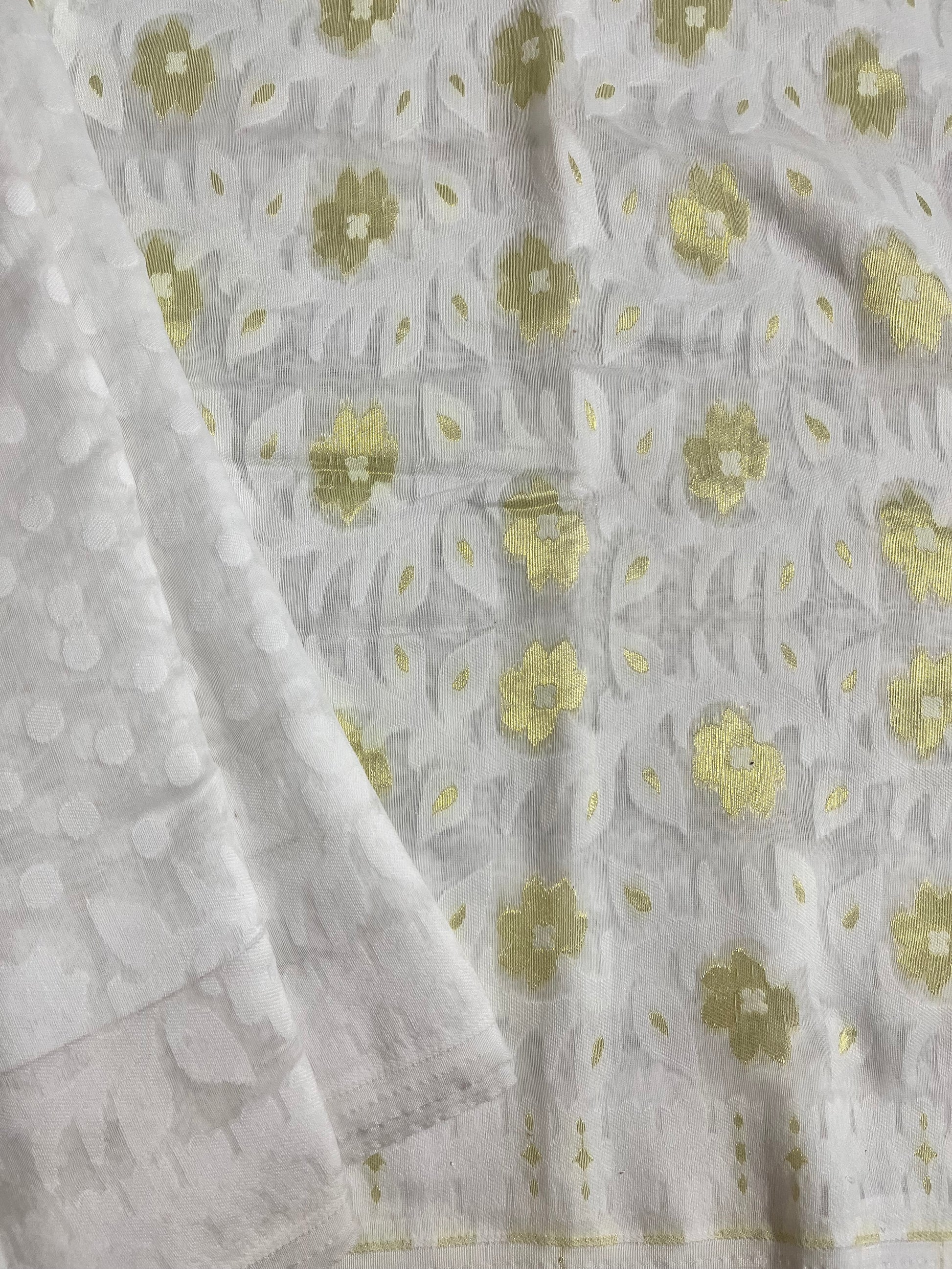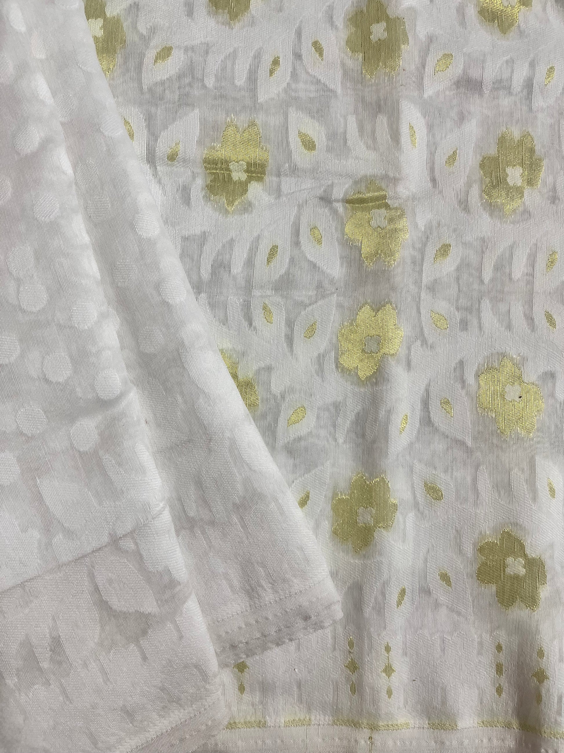 Discover our White Jamdani saree, a masterpiece of artisanal craftsmanship. Intricate floral motifs on the pallu, and Polka dots on the body, evoke the allure of Jamdani art.