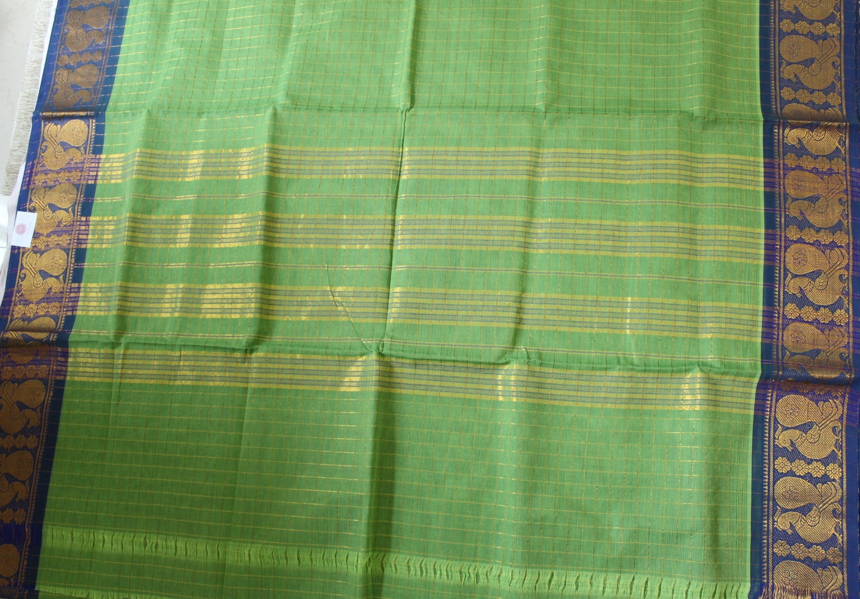 Green Zari Checks Pure Cotton Saree with zari woven mayuri design blue border, the saree comes without blouse.