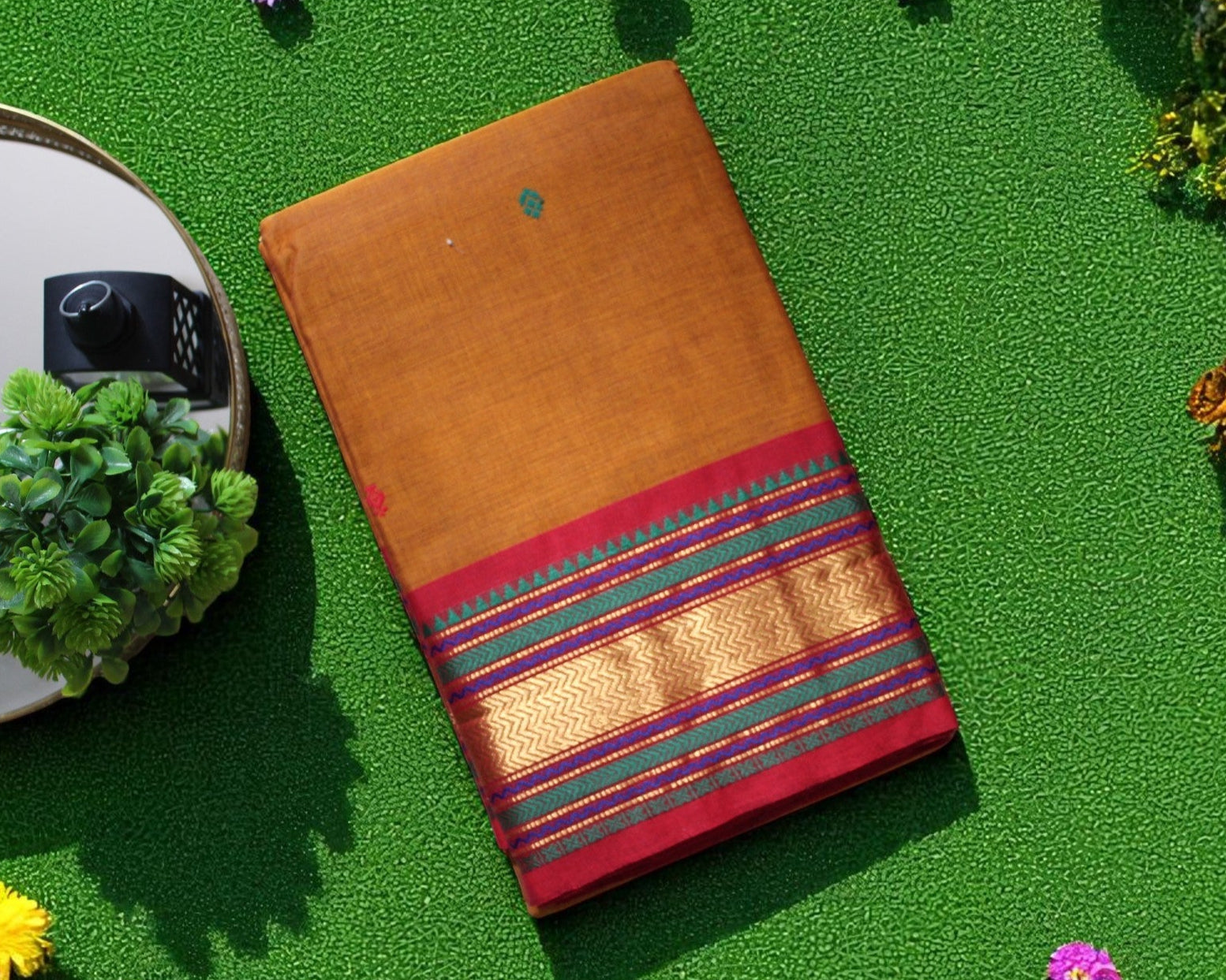 Exquisitely handwoven Kanchi cotton saree with intricate weave. The thread and Zari work border exude old world charm and class while still being vibrant and in trend. Buy online Kanchi cotton Traditional Sarees for an Authentic Style. The saree comes with a running blouse.